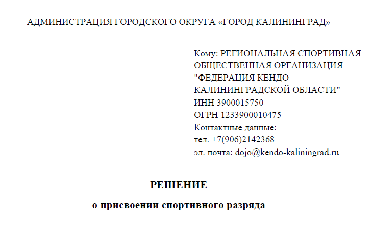 По результатам Чемпионата и Первенства Калининградской области по кендо, прошедших 24 мая 2025 года, спортсменам, выполнившим требования, предусмотренные Единой всероссийской спортивной классификации, присвоены спортивные разряды: